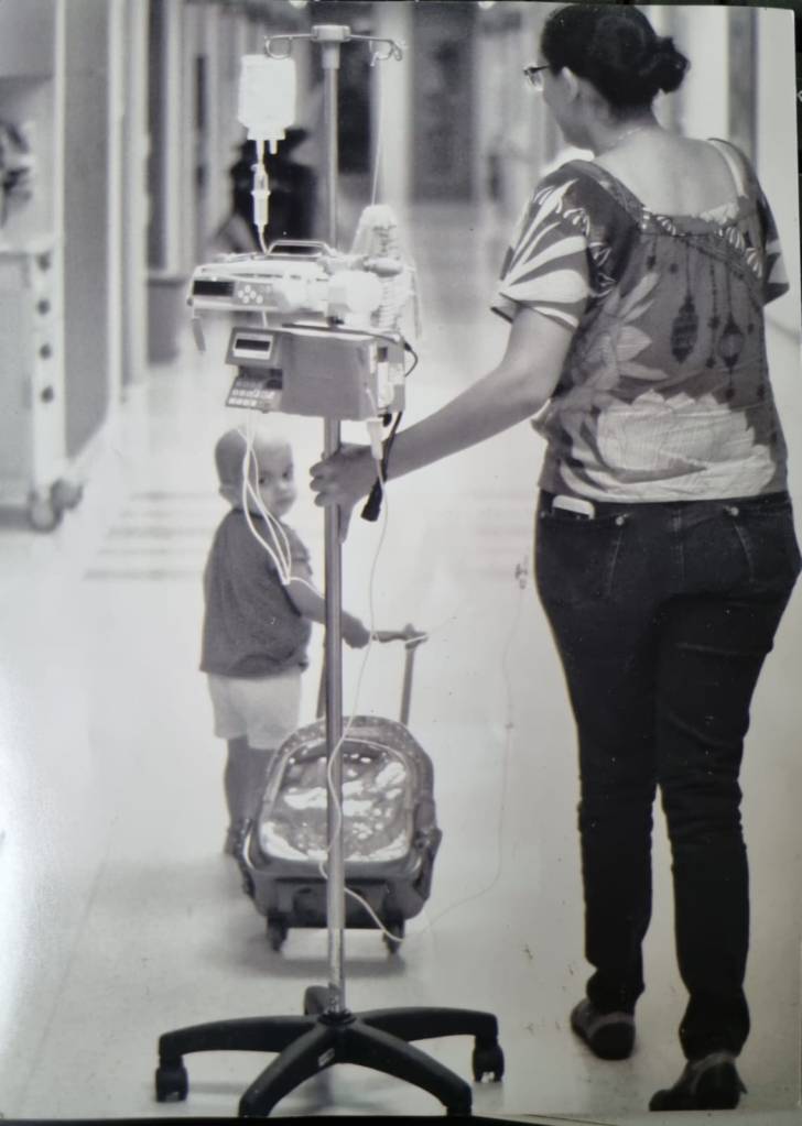 Tem uma foto que você tirou que retrata bem os nossos dias na UTI, nossas caminhadas diárias entre o leito e a salinha de brinquedos, empurrando as bombas e soro e Ana Lucy levando a mochila rosa, maior que ela. rsrs